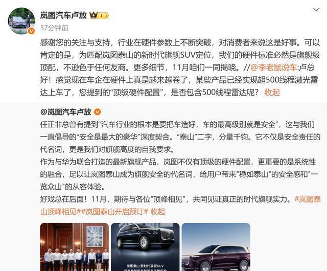 最近这段时间,高端车圈里关于 “高线数激光雷达” 的消息特别多。先是极氪 9X 率先用上了 520 线激光雷达,接着蔚来 ET9 也宣布会搭载 500 线级别的产品。就在大家好奇 “下一个是谁” 的时候,岚图汽车董事长卢放在微博上的一句话,直接点燃了讨论 —— 他说岚图泰山的硬件会是 “旗舰级顶配,不逊色于任何友商”。明眼人一看就知道,这基本就是在暗示,岚图泰山要装超 500 线的激光雷达了。