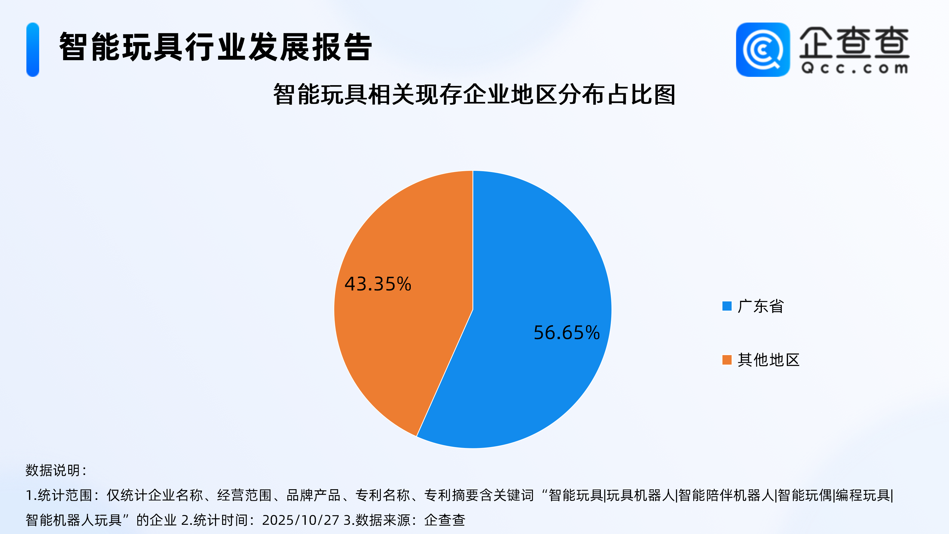 据财联社报道,在第24届汕头·澄海国际玩具礼品博览会上,越来越多融合智能元素的玩具最新推出,玩具厂商拥抱AI、技术厂商加速支持的“双向奔赴”趋势明显。汕头市澄海区玩具协会常务副会长黄亮透露:“目前最受青睐的AI玩具主要是智能陪伴机器人、AI故事机、AI编程玩具及具备对话能力的智能宠物/玩偶。核心应用场景聚焦于教育陪伴和互动娱乐,主要消费群体是3-12岁儿童的家长,尤其是重视教育投入、追求科技新潮的80后、90后父母。”随着“AI+硬件”的深度融合,AI玩具被视为是大模型落地的最佳场景之一。今年以来,AI玩具遍地开花,各大电商平台的AI玩具销售火爆。AI玩具玩家从创业公司到上市公司再到互联网大厂,融资、量产、销售如火如荼地进行。今年9月,AI机器萌宠公司萌友智能(Ropet)完成数千万人民币A1轮融资;8月,AI玩具跃然创新(Haivivi)官宣完成2亿元A轮系列融资。企查查数据显示,截至10月27日,国内智能玩具相关企业现存量达2450家,主要集中在广东省,占比达56.65%,广东省内智能玩具相关企业主要分布在深圳市、汕头市、东莞市等城市。从成立年限来看,国内智能玩具相关现存企业多成立于5年以上,其中成立年限在5-10年的相关企业,占比达58.53%。从国标行业分布来看,归属于批发和零售业的相关企业最多,占比达36.17%,其次为制造业、科学研究和技术服务业,分别占比22.1%、17.82%。1、国内智能玩具相关企业现存量达2450家