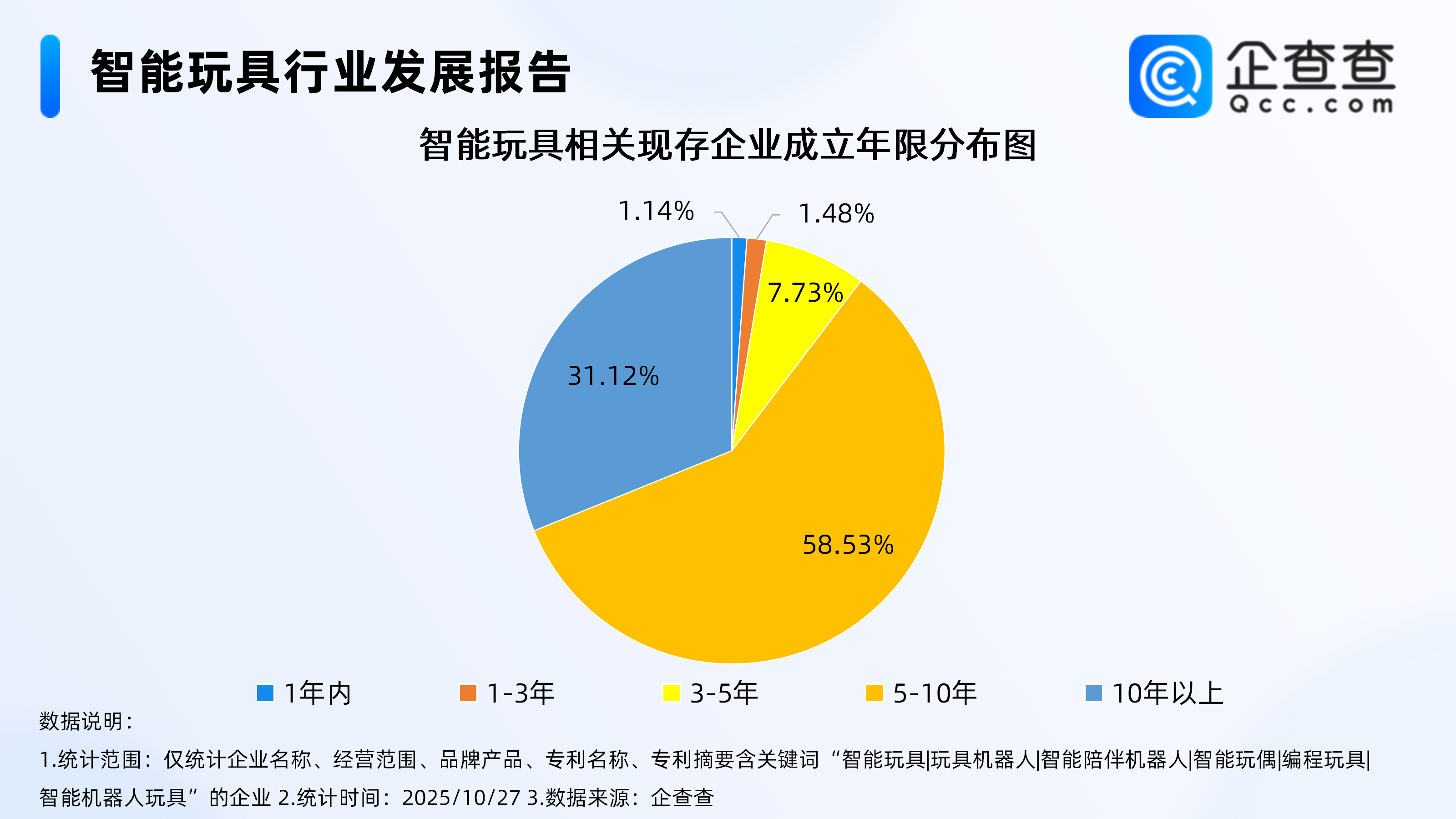 企查查数据显示,截至10月27日,国内智能玩具相关企业现存量达2450家,主要集中在广东省,占比达56.65%,广东省内智能玩具相关企业主要分布在深圳市、汕头市、东莞市等城市。其中,分布在深圳的智能玩具相关企业,占广东省相关企业存量的68.01%,占全国相关企业总存量的38.53%。2、相关现存企业多成立于5年以上
